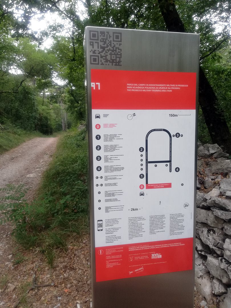 Partendo da Prosecco dal Monumento ai Caduti, si fa circa un chilometro prima di arrivare all'inizio del percorso lungo il quale si trovano i Totem con i QRcode che permettono di accedere alla scheda descrittiva.