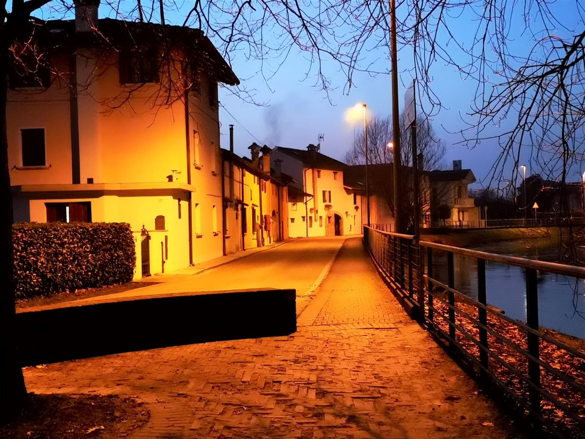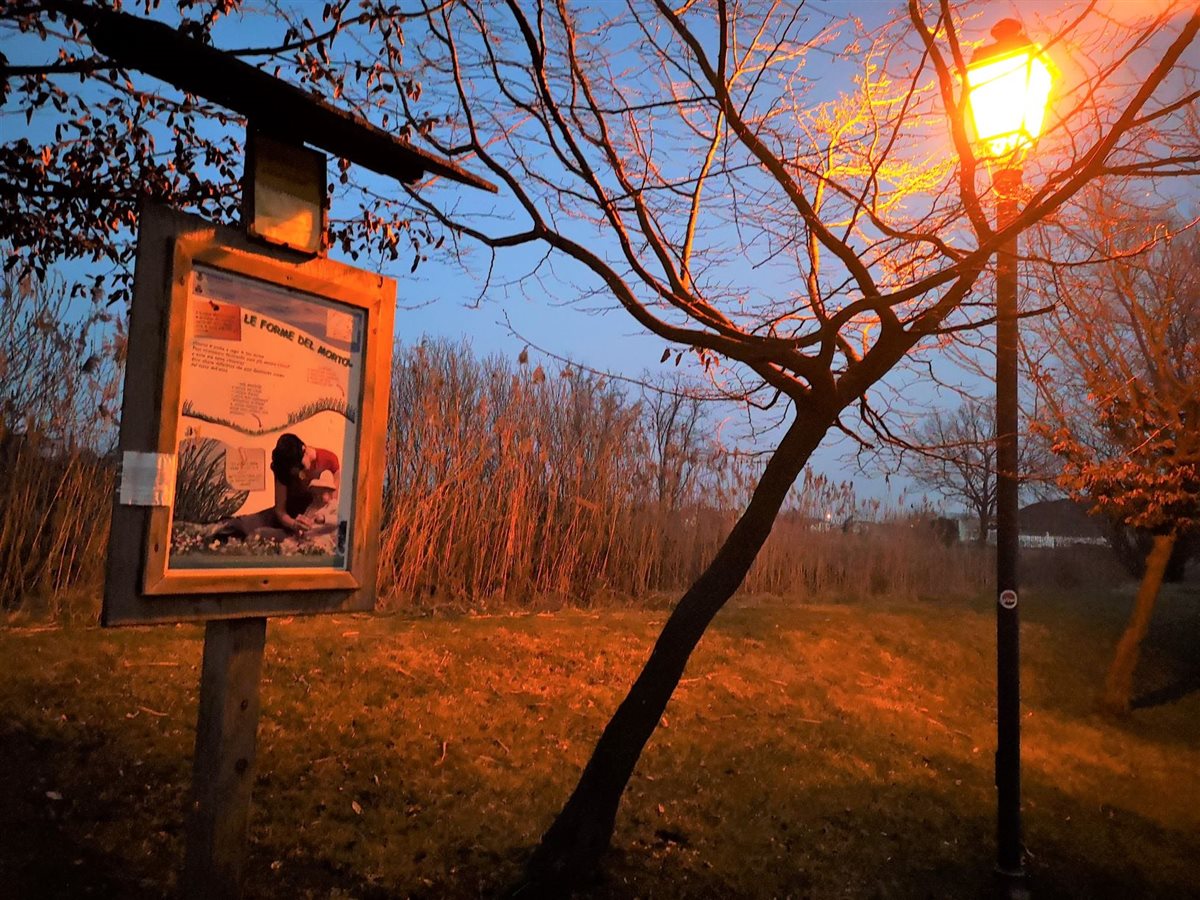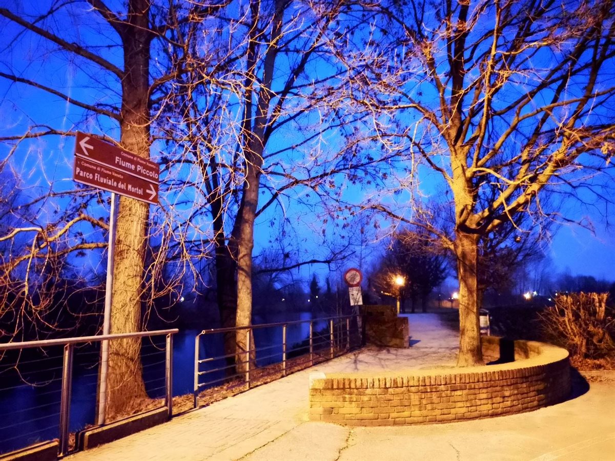 Dal ponte di Fiume Veneto/PN, con luce chiara, un semplice tratto in Parco è stato per me occasione di trèmiti all’imbrunire. La segnaletica indica verso il salice dalla verde chioma, lungo il fiume Fiume e oltre, nel parco del ramo che non scorre, morto appunto. Solo un’ora di tempo in tasca. L’idea di scoprire un’area naturalistica, a piedi, era frenata dal veloce cambio di luce. La parola Mortol, al tramonto, dipingeva di ombre la scena. La voglia di conoscere ha prevalso sui dubbi. Pochi passi e già alle spalle avevo un contesto irreale, veneziano. Il tracciato proseguiva, a dossi e a bassure. Vedevo erbe umide, a terra, in un globale secco come le alte canne palustri. Incontri silenziosi: alberi spogli, qualche merlo, una panchina occupata, spazi con possibili uscite, qualche anima in bici, a piedi. Indifferenti le anatre a riva. Il ramo morto esiste, è un’ansa seminascosta. Lo specchio fluviale scorre veloce, parallelo al viottolo. Chiusa la Chiesa della Beata Vergine Addolorata, XVII sec. La torcia mi ha aiutato a vedere scalini imprevisti, a cogliere la vista di case emergere come in un camèo, un gioiello, inatteso. Un flash di riflessione, citando Ruth Renkel: Non abbiate paura delle ombre, significano che c’è della luce che splende lì vicino. Ripresa la via, il conforto di case vicine. Allo stop potevo tornare nei rumori, invece ho ripreso la via del Parco, tra il buio e le luci dei lampioni, costeggiando in solitaria il fiume che nell’umidità mi nascondeva tanto.  L’atmosfera faceva accelerare. Finite le case, passata la fontana, superate le solitarie panchine, giusto in tempo al ponte e al parcheggio.
