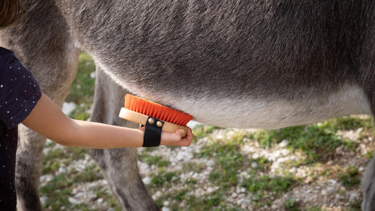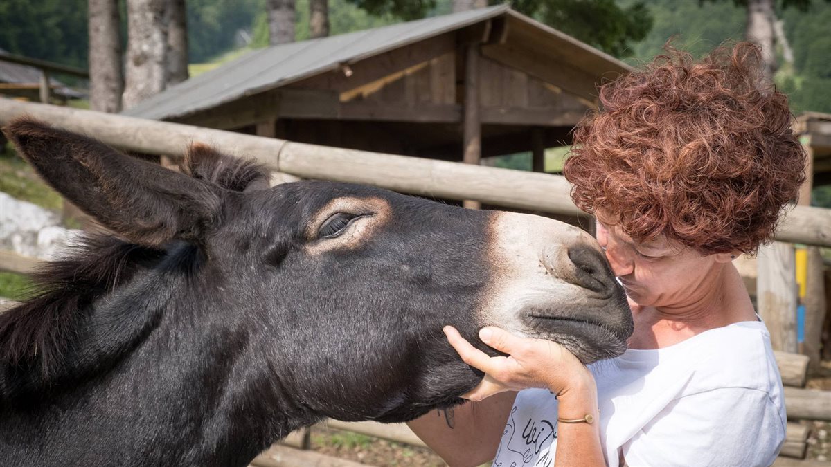 Il punto di ritrovo era al rifugio La Genzianella, dove hanno casa gli asini, proprio accanto al parco attrezzato e alla pista da sci. Qui ho trovato le nostre guide della Compagnia degli Asinelli di Pordenone, che ci hanno accompagnato in maniera professionale ed accorta per tutto il percorso. Karin, Cristina e Ledy accolgono i piccoli ospiti con i loro genitori e spiegano loro le abitudini degli asini, facendo prendere confidenza con gli animali, sia spazzolandoli che accarezzandoli.