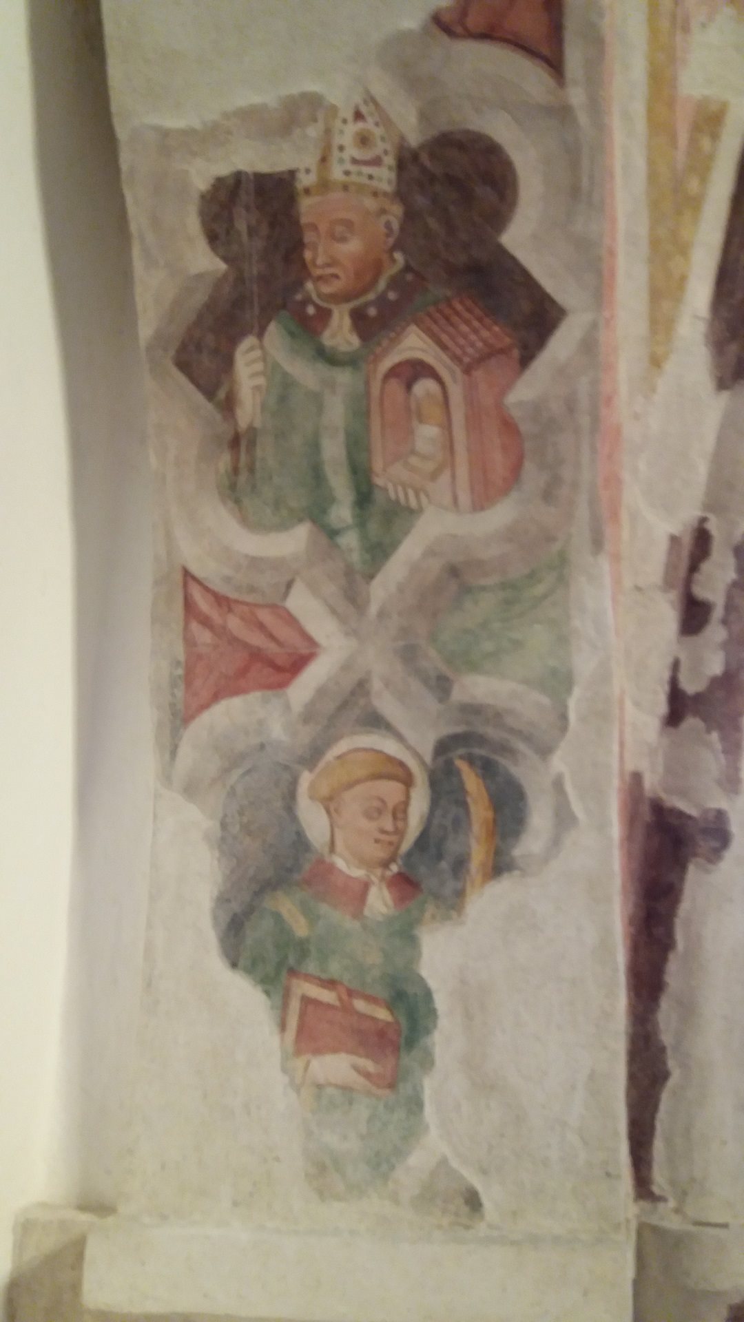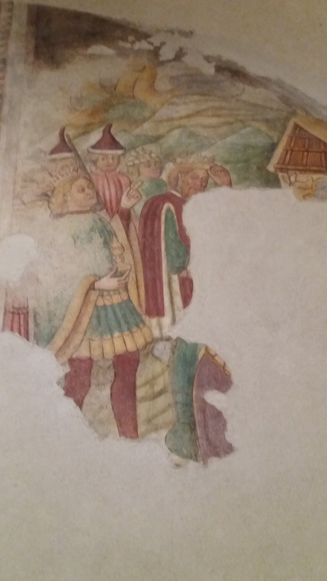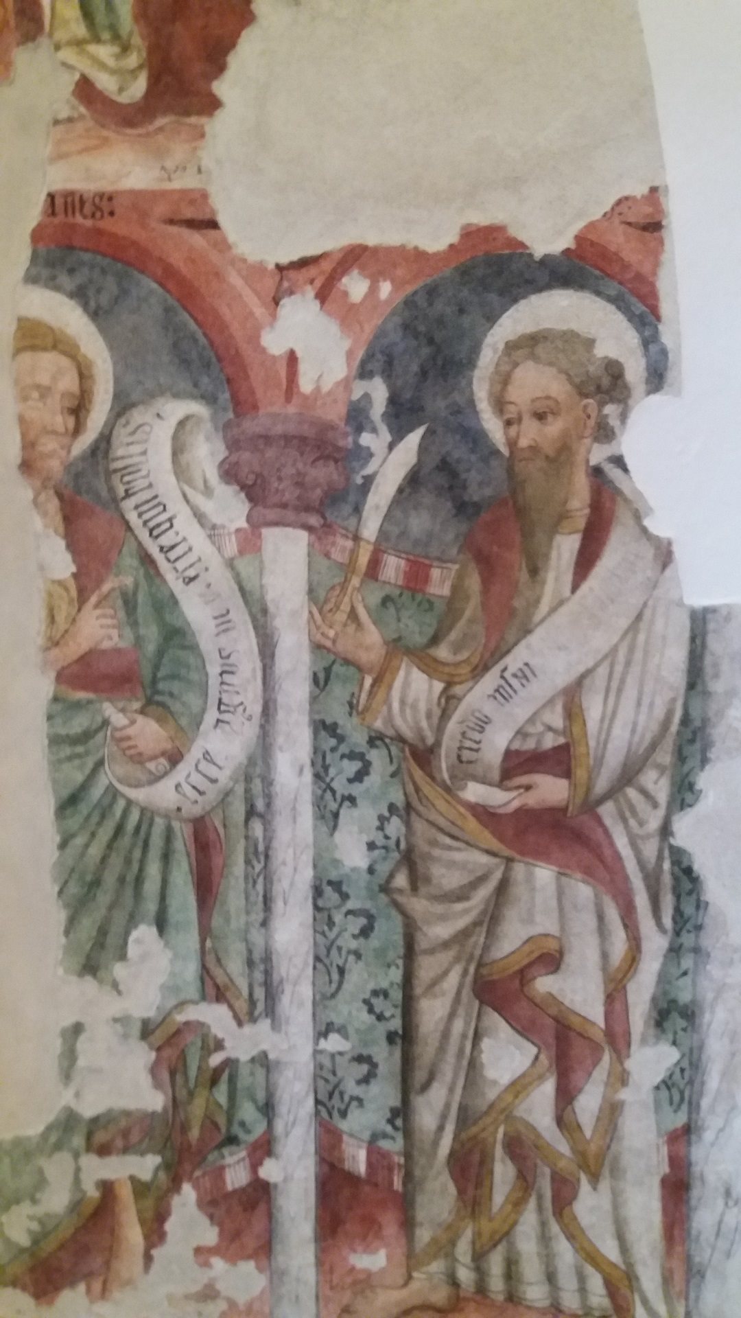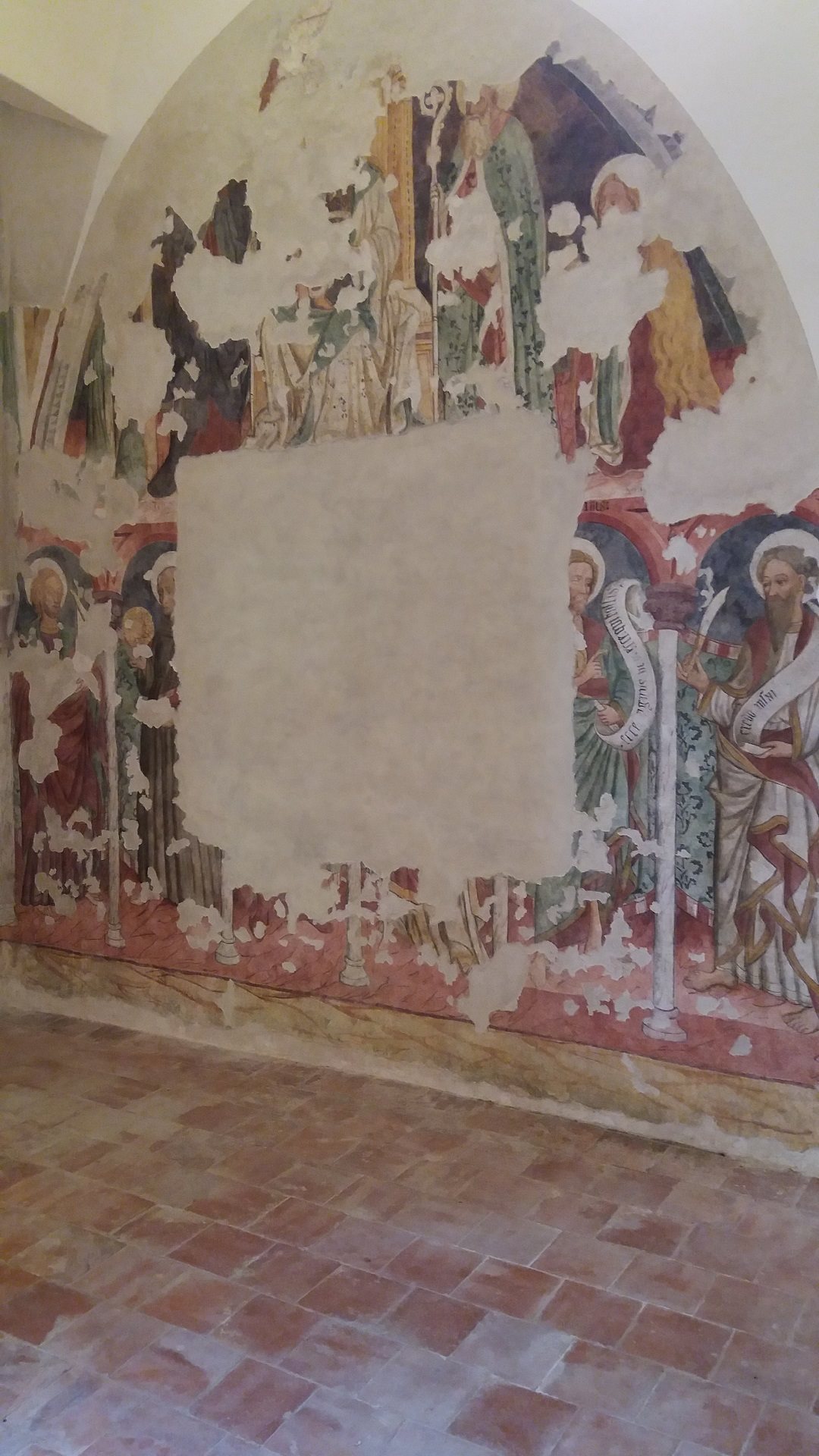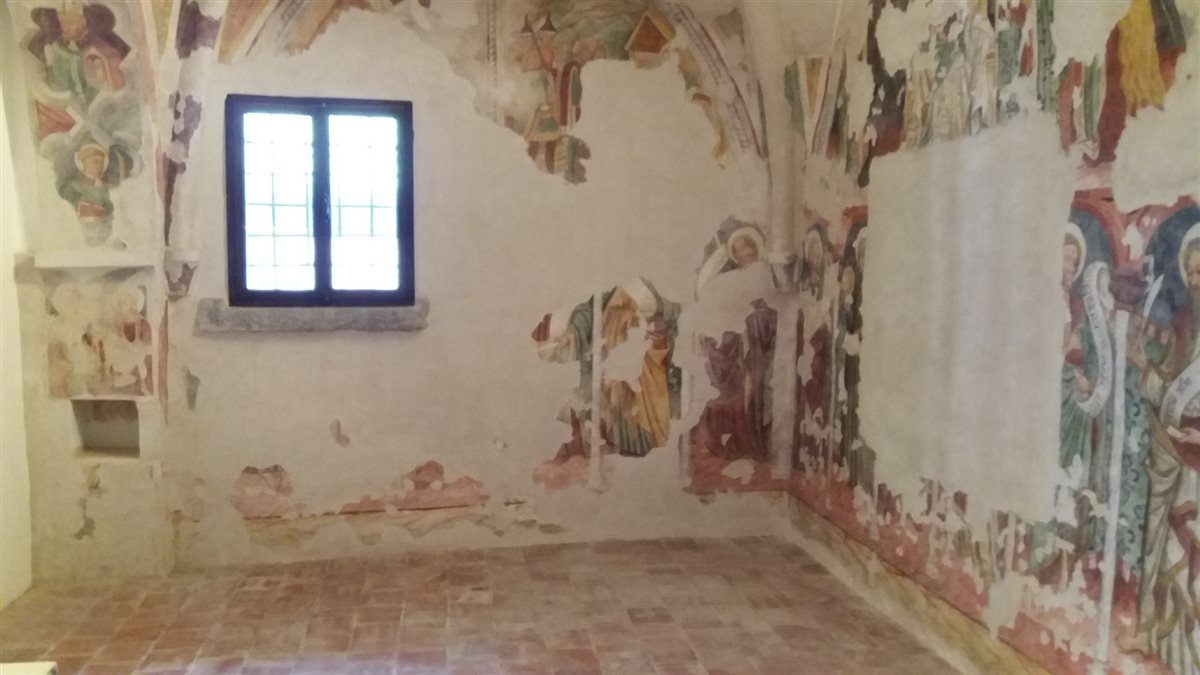 Il ciclo, realizzato fra il 1480 e il 1489, offre una teoria di apostoli e santi, sei per parete. Su quella di sinistra sono parzialmente visibili tre figure di discepoli con cartiglio, sul muro di fondo compaiono, dopo un seguace di Gesù, San Bernardino da Siena (in saio con Signum Christi in mano), San Giovanni Battista e San Bartolomeo. Purtroppo un’ampia lacuna centrale non consente di individuare gli altri soggetti. In alto sempre a sinistra è visibile la scena dell'Adorazione dei Magi. che portano doni a Gesù nella capanna di Betlemme; sopra un vescovo con in mano una chiesa che si ipotizza possa essere proprio la pieve di Forame; non è noto invece il nome dell’artista o degli artisti che hanno realizzato l’opera, si presume sia la felice “mano” di un maestro anonimo di origine e impostazione tedesca.