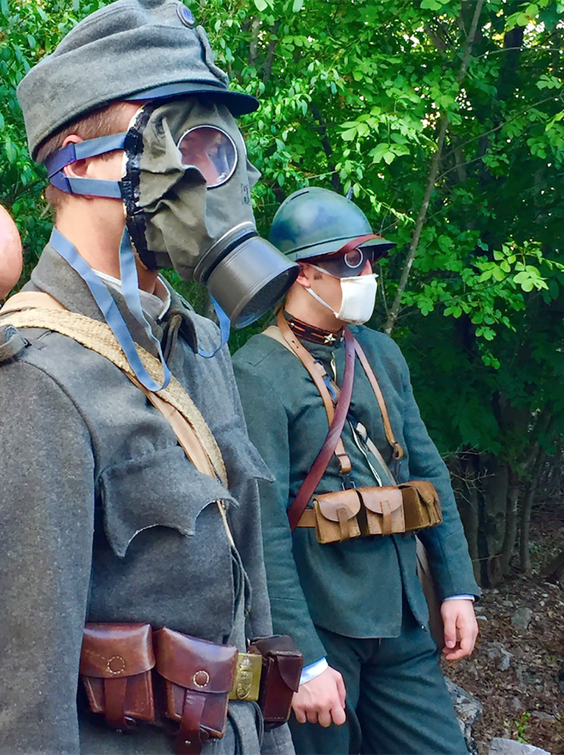 I rievocatori del Gruppo Storico Culturale I Grigioverdi del Carso ci aiutano a visualizzare l'aspetto dei soldati: le loro divise, le loro maschere antigas e la loro attrezzatura mentre la voce narrante ci guida attraverso i diari dei soldati, le loro poesie e racconti.