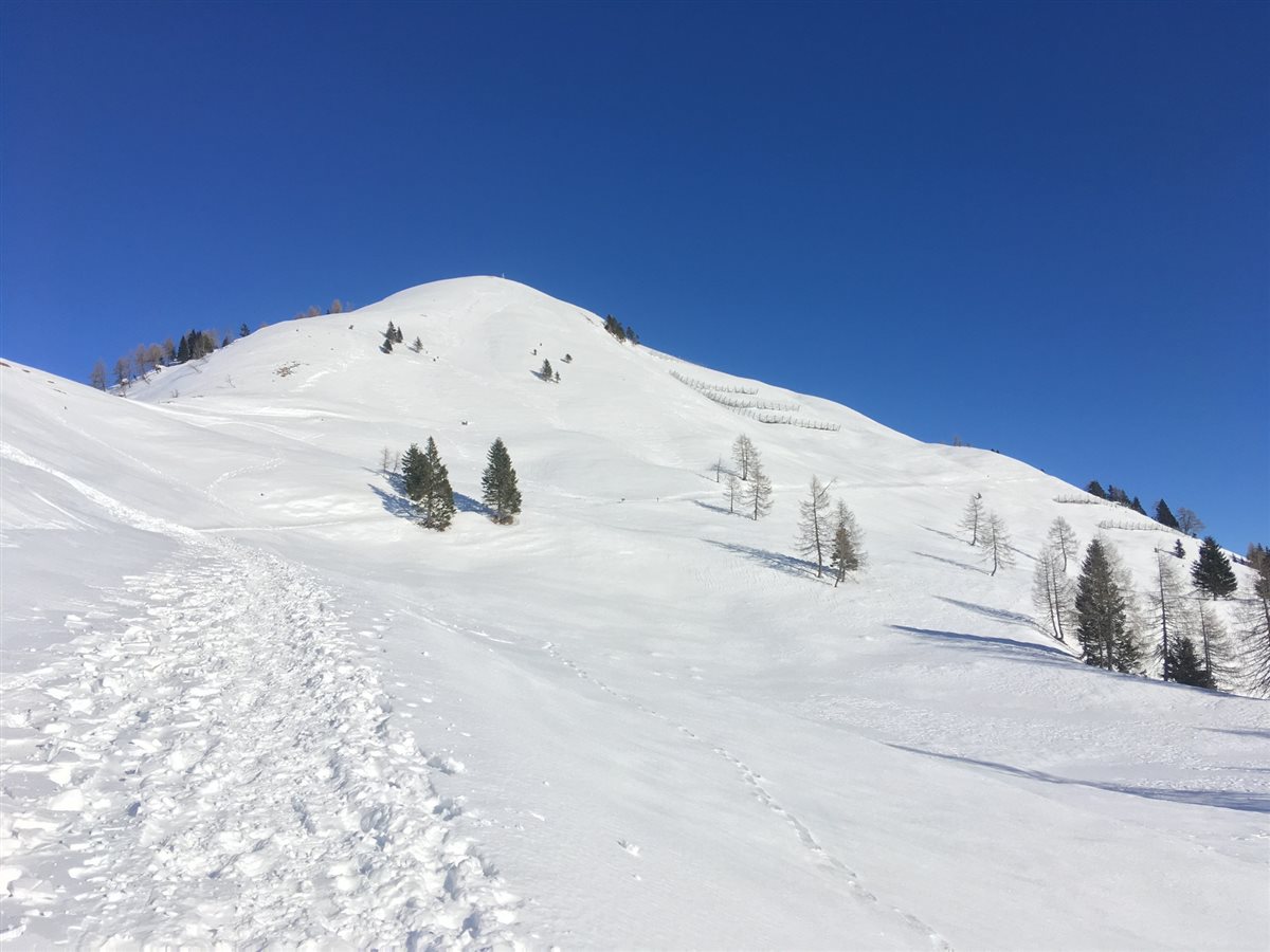 Imboccavo il sentiero Segnavia Cai 204 a valle, dietro l’albergo diffuso ma solamente dopo aver divorato un favoloso panino con il prosciutto locale, in assoluto il più buono che abbia mai mangiato, si sentiva tutto il gusto della montagna. Dopo una prima salita che metteva in difficoltà il respiro e dopo aver attraversato un bosco fatato, si apriva davanti a me un meraviglioso panorama. Soffice distesa bianca, una nuvola di neve e leggerezza, solo lo scricchiolio dei miei passi interrompeva quella quiete. La quota massima raggiunta era 1975 metri, quindi circa 700 m di dislivello dalla partenza. La montagna ha il suo fascino anche d’inverno e non per forza scoprendola sulle piste da sci. Addentrarsi nei boschi innevati è un’esperienza che consiglio vivamente.