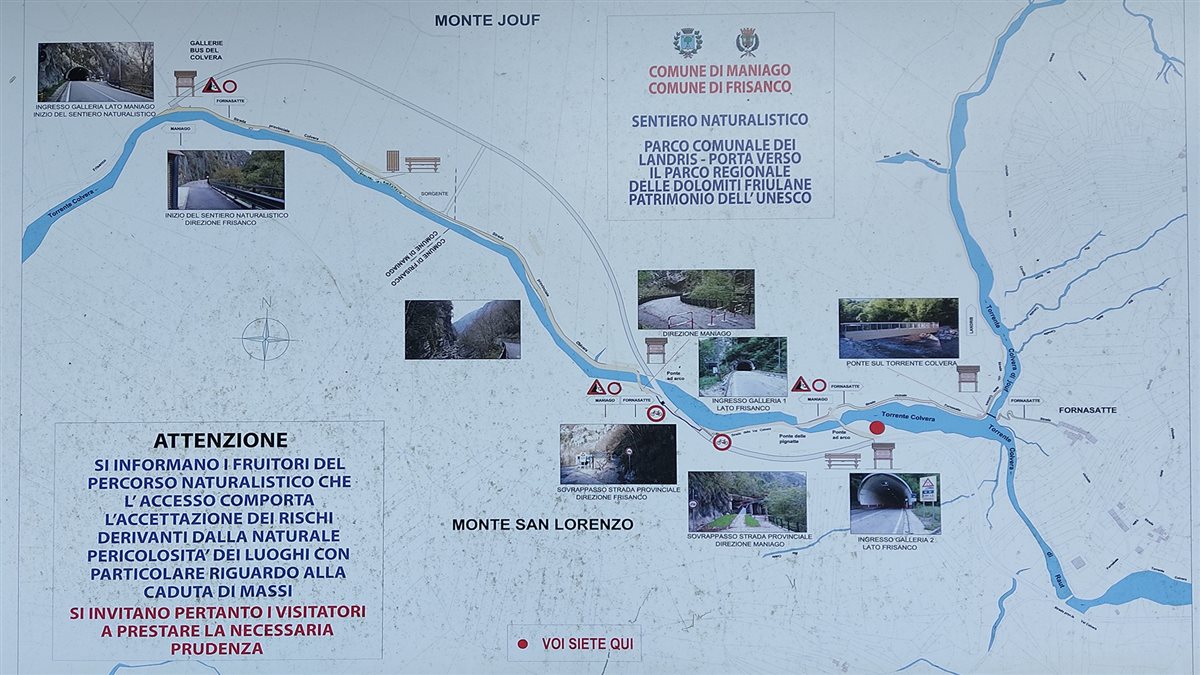 Da Maniago si segue la strada per Frisanco e poco oltre le gallerie si piega a sinistra per passare su un ponte il torrente Colvera; aldilà c’è una struttura ricettiva con un ampio parcheggio. Si inizia a camminare sulla stradina asfaltata per raggiungere il nucleo di case di Fornasattis.