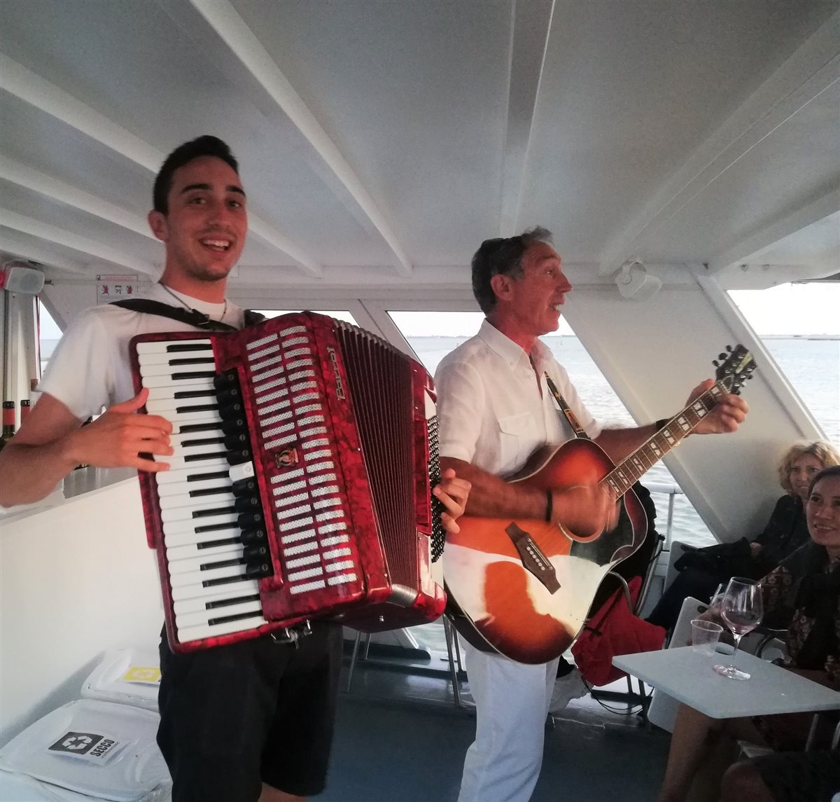 A coronare l’emozionante esperienza della navigazione, proprio poco prima del tramonto, la degustazione di tre vini dell’Azienda Vinicola Vini Puntin aderente alla Strada dei Vino e dei Sapori del FVG che ci sono stati raccontati direttamente dal loro produttore e un’ottima spaghettata a base di pescato locale accompagnata dalla chitarra e della fisarmonica suonati dal capitano e il suo staff!
