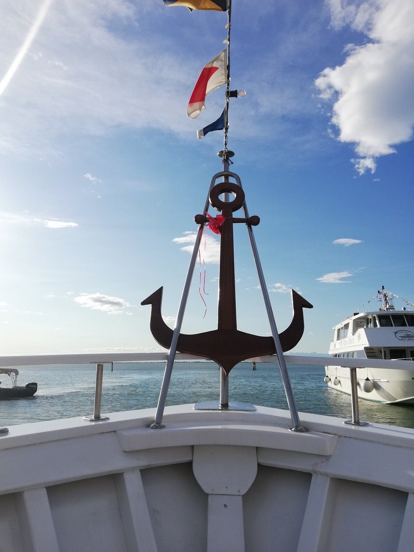 Ad accogliere i partecipanti nella Darsena di Lignano Sabbiadoro il Capitano Adriano e il suo staff che con la loro consueta allegria ci hanno fatto imbarcare nella Motonave Nuova Saturno da Geremia alla volta di Marano Lagunare: davanti a noi le acque calme della Laguna di Marano delimitate dai tipici pali in legno, le bricole, la Litoranea Veneta, l’antica via d’acqua realizzata dalla Repubblica Serenissima e sullo sfondo il profilo blu delle montagne.