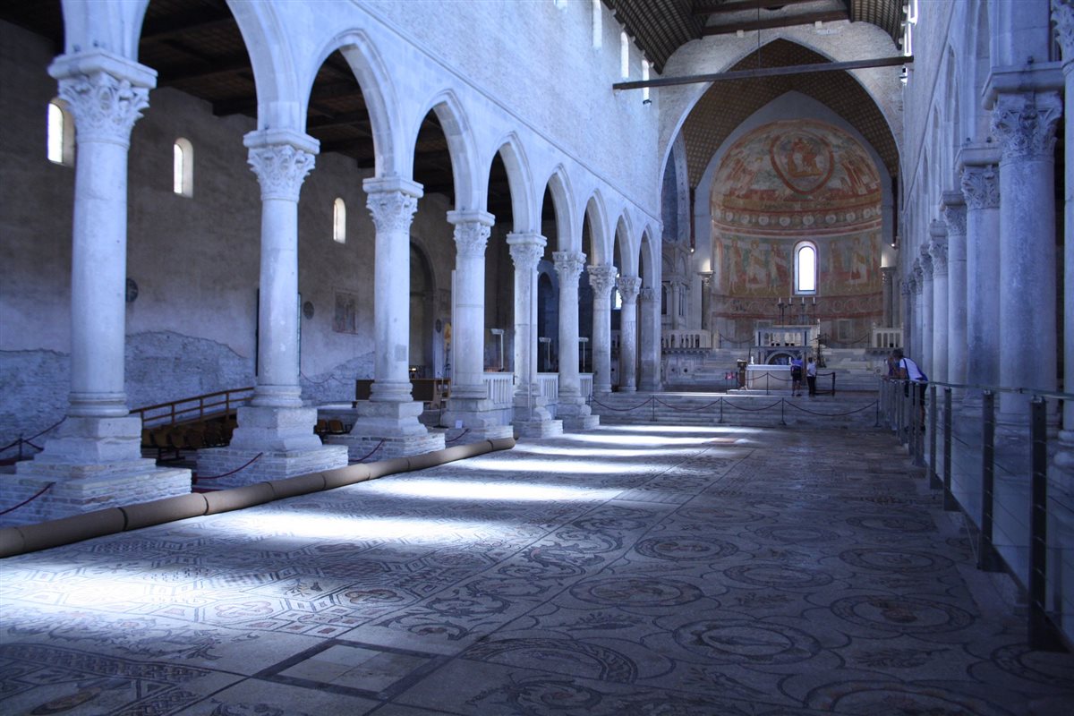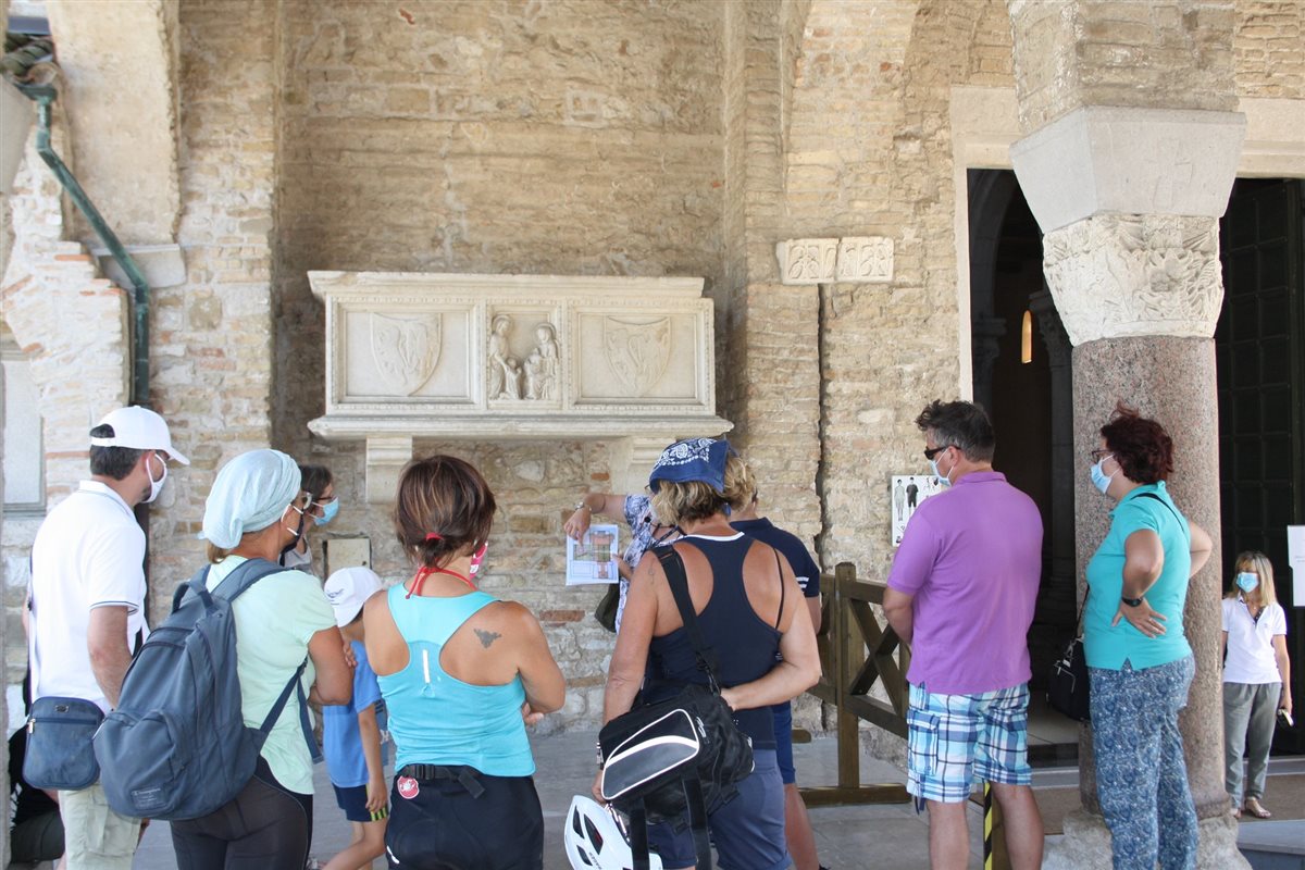 Ad attenderci al Porto la nostra guida turistica che, raccontandoci aneddoti e curiosità ci ha condotto fino alla Basilica episcopale di Santa Maria Assunta, dove colpisce in particolar modo lo stato di conservazione dell’ampio pavimento ricoperto di mosaici, testimonianza del complesso originario della basilica risalente 313 d.c.