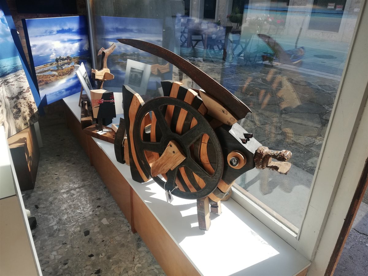 Abbiamo aperto il tour con La Botega di Nico Gaddi, un vero e proprio laboratorio creativo che raccoglie espressioni artistiche di varia natura: dalla pittura alla scultura, dall’incisione alla fotografia e che trovano come denominatore comune il legame con la laguna. Sculture più grandi di un uomo ricavate dal legno di antiche batele, vecchie botti di vino che sono diventate ventre di un Moby Dick surreale, riproduzioni di teste di animali create con vecchi serbatoi di moto e materiali di recupero, pesci scolpiti nel legno corroso dal mare.