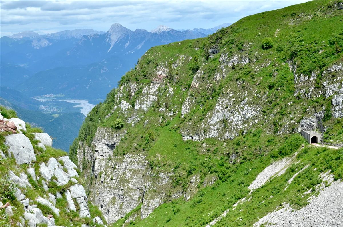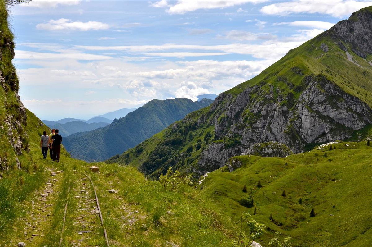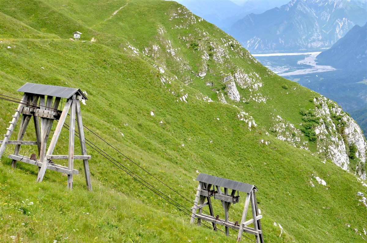 Seguendo i vecchi binari ad alta quota, sui quali un tempo transitavano i carrelli carichi, si attraversa una galleria fino a raggiungere la teleferica.