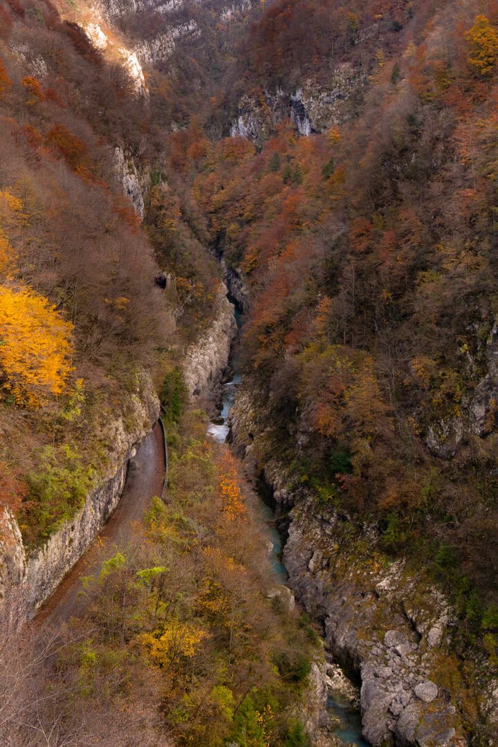Ultimo week-end di ottobre, il tiepido sole d’autunno splende e riempie di riflessi color smeraldo il magico lago artificiale di Aprilis comunemente noto come lago di Barcis. La giornata si presta ad una bella camminata lungo il sentiero del Dint, attraverso il suo bosco di faggi e rocce carbonatiche che in questa stagione, gli amanti del foliage e della natura, apprezzeranno sicuramente. Grazie ai suoi tre belvedere che s’incontrano lungo il tragitto si hanno delle vedute del lago e delle montagne strabilianti. Il primo lo skywalk del Dint, una passerella metallica sospesa nel vuoto, mi ha sorpreso non solo per la sua vista mozzafiato che si affaccia sul lago ma per la parte finale del pavimento tutta in vetro, sopra la forra del Cellina: mi sembrava di volare. Proseguendo attraverso il bosco e stando attenta a non scivolare sono arrivata al secondo belvedere dove sono riuscita ad ammirare l’insenatura del Cellina e l’antica strada della Valcellina: strettissima e incastratissima nella montagna. Infine, quando sembrava non arrivare mai ecco, la ciliegina sulla torta, il terzo ed ultimo belvedere che, grazie alla sua scala a chiocciola in salita verso il cielo, domina a 360° l’intera vallata pordenonese fino al paese di Andreis. Non vi dico il freschetto lassù, perciò, congelata ed emozionata, ho intrapreso la via del ritorno attraverso la strada asfaltata che riporta al punto di partenza: il centro visite della Riserva Naturale Forra del Cellina. L’autunno e l’inverno limitano moltissimo le numerose attività che offre questa splendida località turistica ma regala una quiete indescrivibile e a volte, con un bel colpo di fortuna, anche qualche vista inedita, tipo l’intasamento della strada vecchia dovuto alla transumanza. Una gita, insomma, per tutti i gusti!