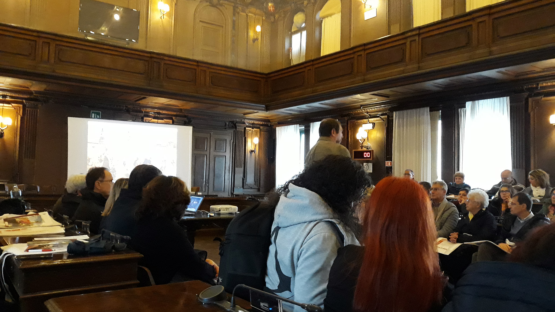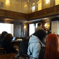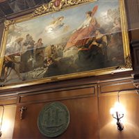 Siamo stati accolti da alcuni addetti alla visita, che ci hanno descritto la Sala del Consiglio e ci hanno fatto accomodare sulle poltrone destinate ai consiglieri comunali. Abbiamo poi avuto modo di scoprire alcune peculiarità del dipinto presente nella Sala del Consiglio, La prosperità di Trieste, del piranese Cesare Dell'Acqua e commissionato da Francesco Hermet.