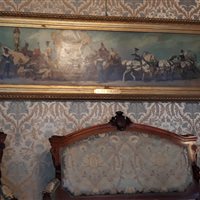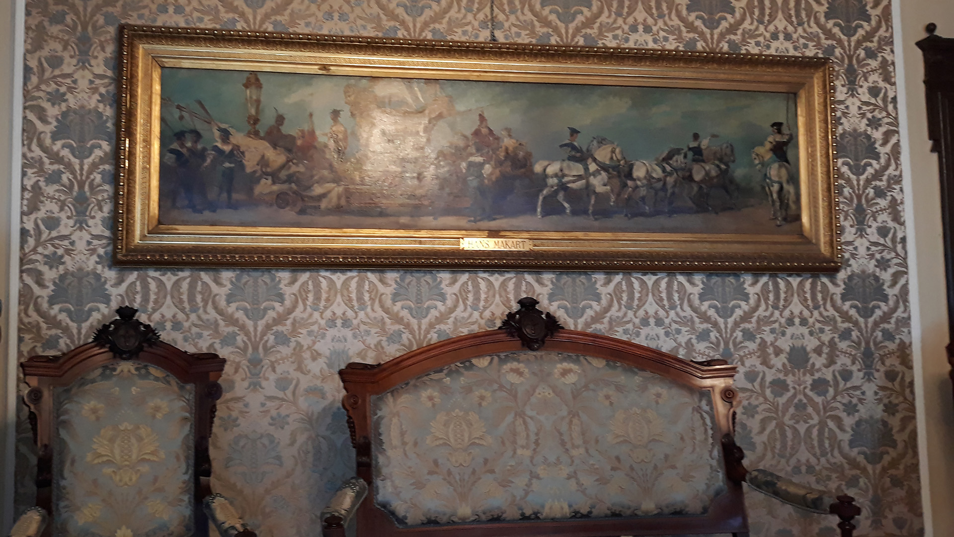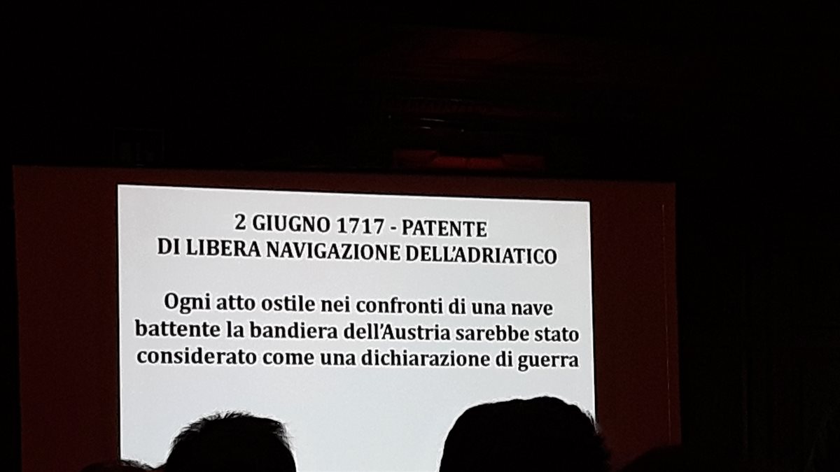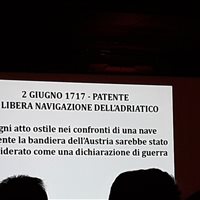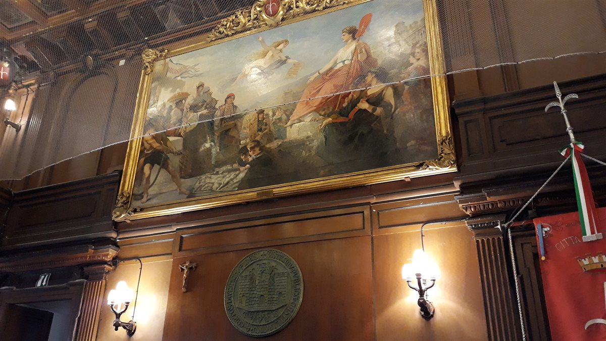 Il dipinto, di ordine politico, esalta la città nelle vesti di matrona romana a sottolineare come la storia della città inizi con l'antichità. Nella realizzazione, in una composizione a puzzle tipica della pittura di Dell'Acqua, troviamo anche la rappresentazione della Telegrafia, la personificazione dei popoli importanti con cui Trieste aveva relazioni commerciali e dei luoghi salienti per la vita cittadina. Divisi in gruppi siamo poi passati nel famoso Salotto Azzurro, sede degli appuntamenti istituzionali del Sindaco, dove è presente il dipinto L'allegoria della navigazione realizzato da Hans Makart nel 1878 in occasione dei festeggiamenti per le nozze d'argento dell'Imperatore Francesco Giuseppe e della consorte Elisabetta.