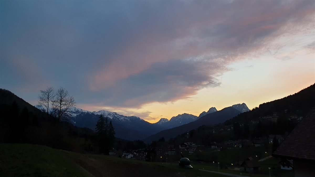 Da qui abbandoniamo il corso del fiume, il tramonto sta lasciando spazio ad uno spicchio di luna e decidiamo di fermarci. Troviamo un parcheggio per camper, non offre servizi ma abbiamo la capacità di essere autonomi per giorni. Il cartello in entrata ci accoglie con un ‘Benvenuti a Ravascletto’.