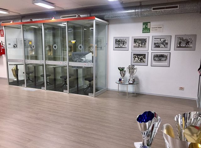 Dopo le foto di rito sul campo, il tour ricomincia e visitiamo la sala stampa, dove nel dopo partita si tengono le conferenze e le interviste. Qui ci sono esposti dei cimeli storici interessanti e le coppe delle vittorie più prestigiose, su una parete sono state mantenute le cabine telefoniche che nei tempi in cui gli smartphone non esistevano, erano l’unico mezzo con cui i giornalisti potevano comunicare freschi aggiornamenti sui risultati delle partite alle redazioni. Mi sembra proprio di vederli: concitati, la cornetta ferma tra la spalla e l’orecchio e una fila di colleghi sbuffanti che aspetta il proprio turno. Che bell’idea mantenere questo ricordo del vecchio Stadio Friuli!
