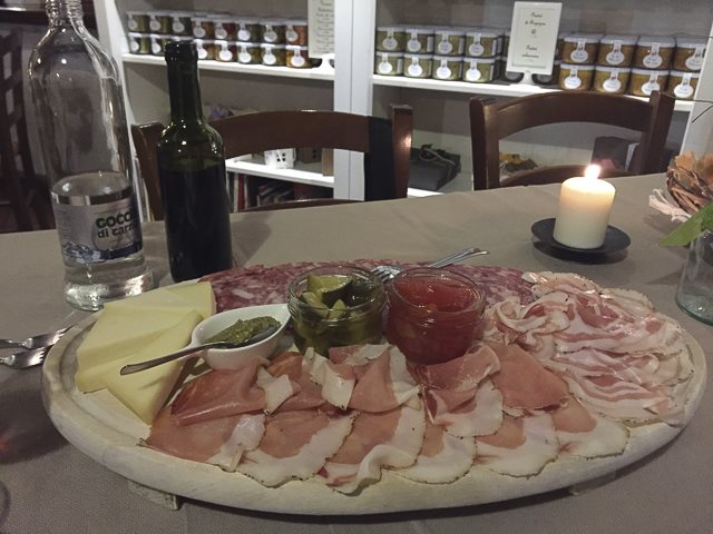 Questa sera siamo pieni di fame e ci lasciamo consigliare dalla proprietaria che ci dà il benvenuto con un tagliere di profumati affettati e formaggi da accompagnare con le creme: spazzolato!