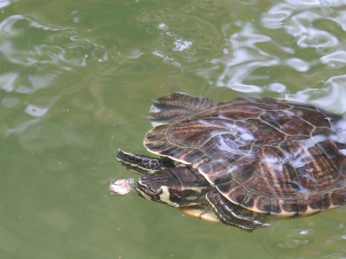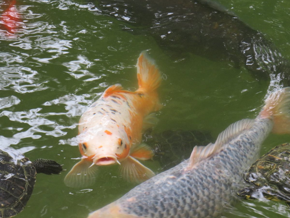 Un’aiuola di fiori incornicia una fontana dove tartarughe e varie specie di pesci accolgono i visitatori.