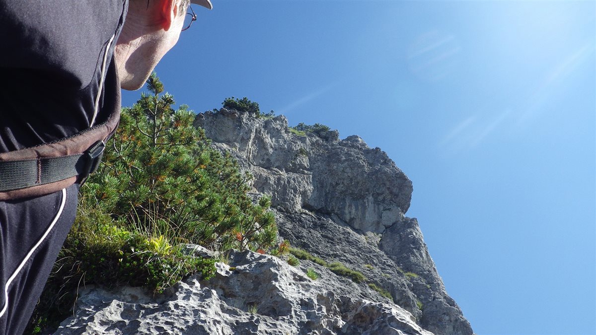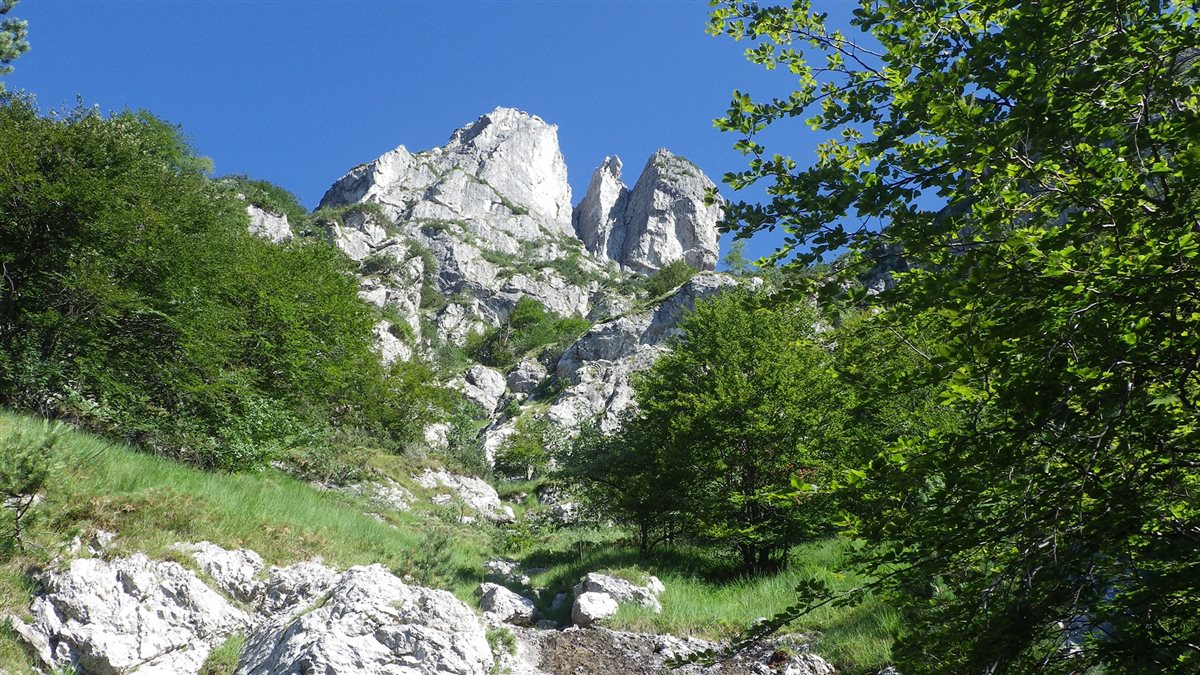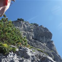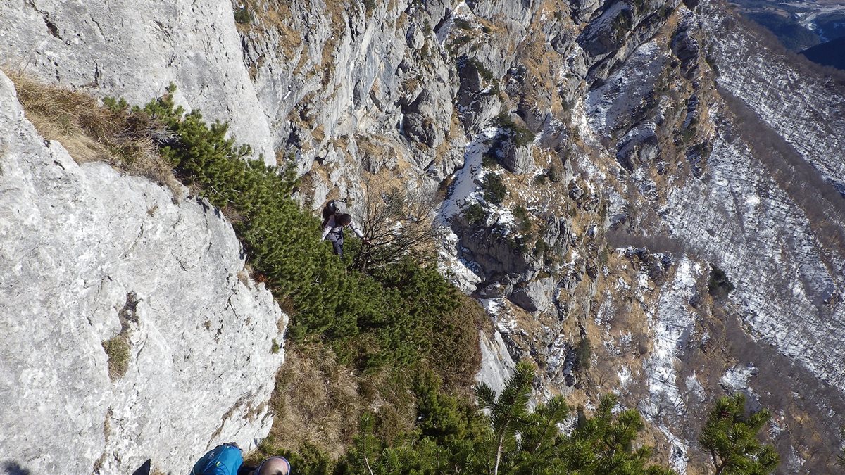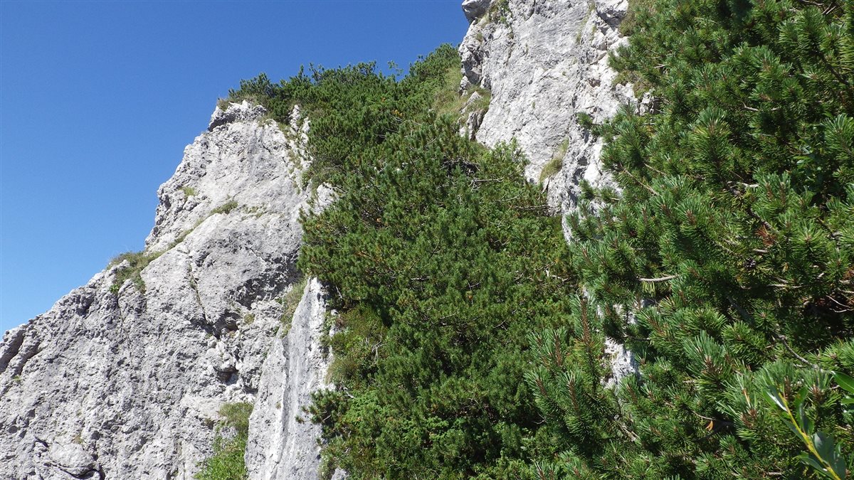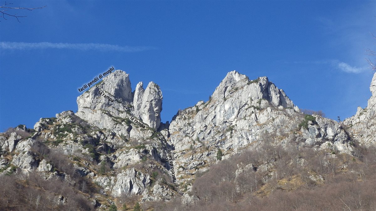 Sotto le pareti una rampa con andamento in salita obliqua da destra a sinistra passa sotto il monolite del becco e permette di superare la parete dell’ala sinistra fino al suo limite estremo dove larghi pendii di pini mughi portano in cima.