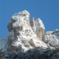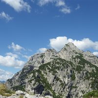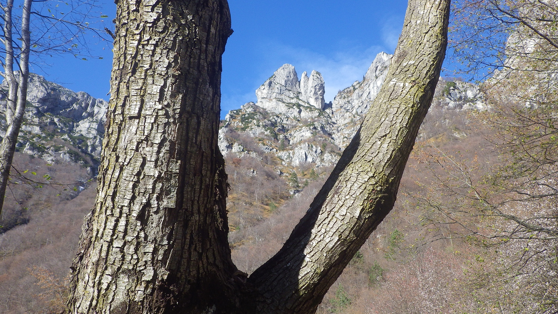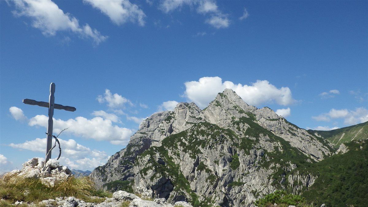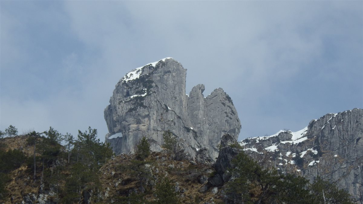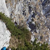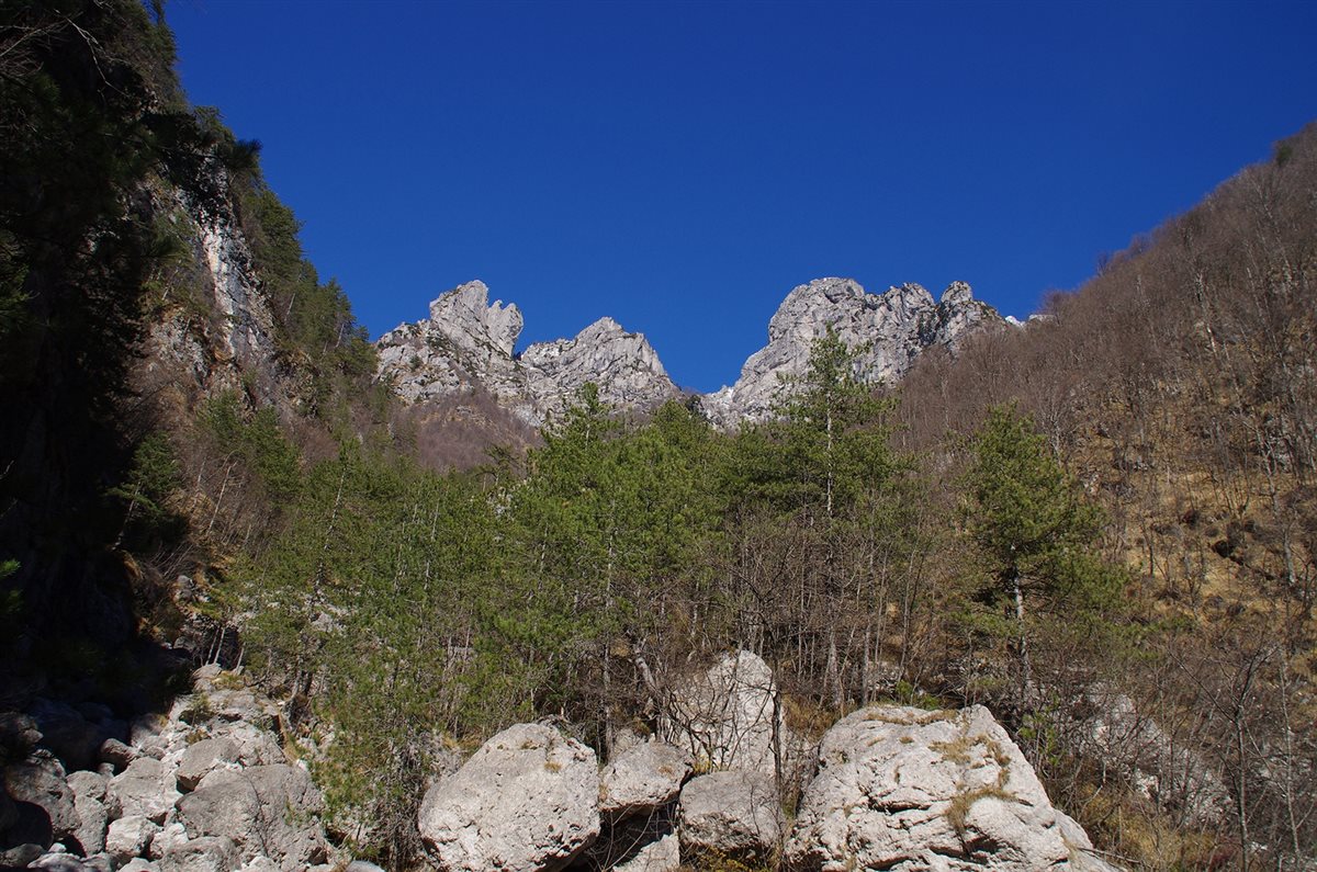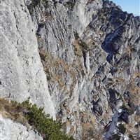 Sotto le pareti una rampa con andamento in salita obliqua da destra a sinistra passa sotto il monolite del becco e permette di superare la parete dell’ala sinistra fino al suo limite estremo dove larghi pendii di pini mughi portano in cima.