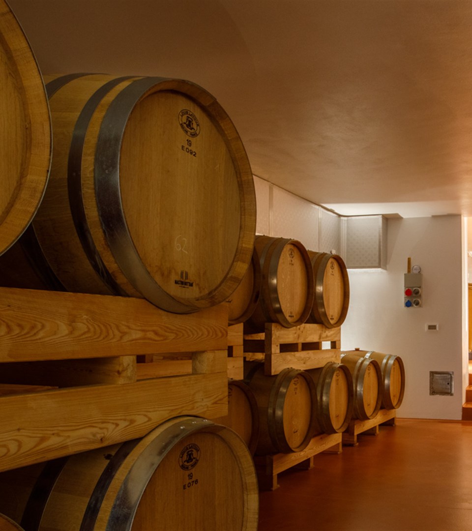 L’affinamento dei vini avviene in tradizionali vasche di cemento, anfore di  cocciopesto e pregiate botti di legno di rovere francese.