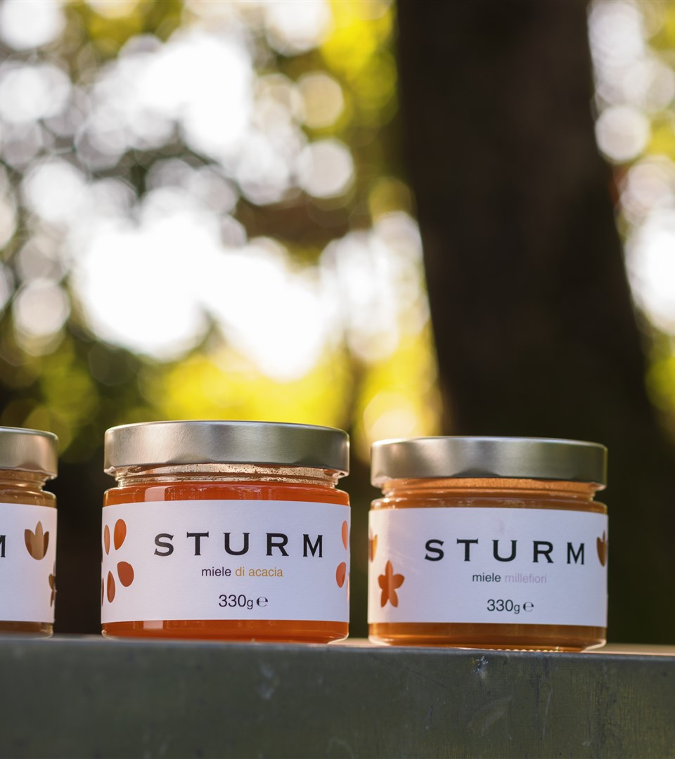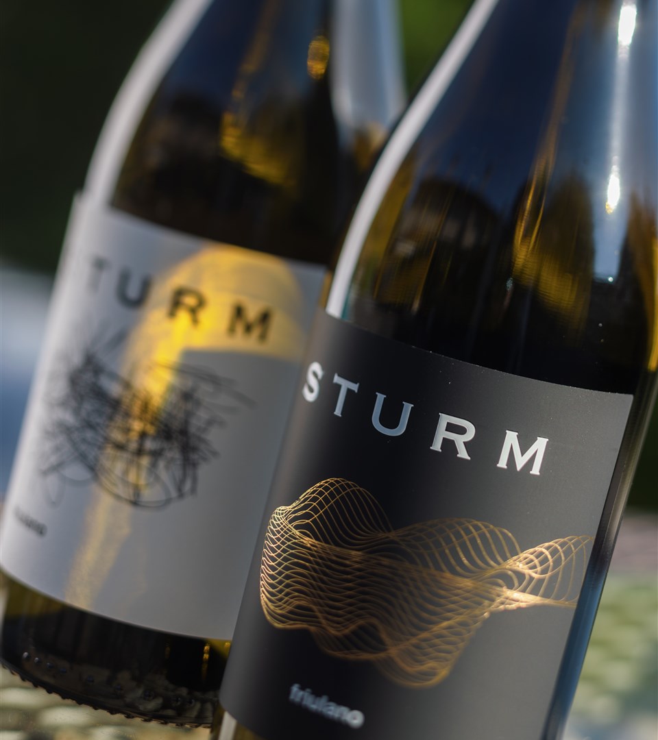 La produzione è contraddistinta da due etichette, nera e bianca: la prima riguarda i vini prodotti e affinati in acciaio, molto tecnici, verticali e floreali, la cui grafica moderna raffigura la tempesta. Infatti STURM significa TEMPESTA, perciò è stato raffigurato il moto del vento e delle onde del mare, rappresentativo della mineralità del nostro terreno (ponca).