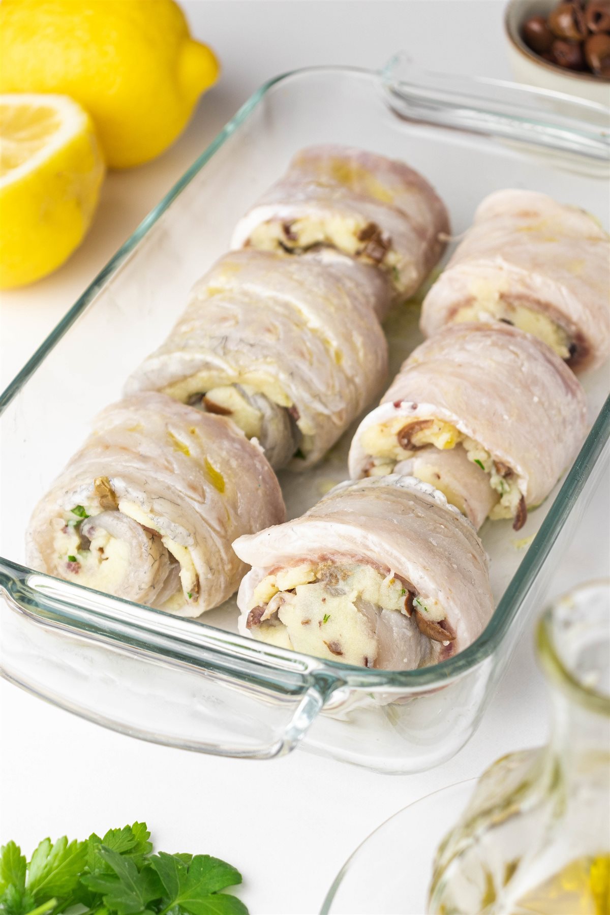 - Prendere le listarelle di branzino, stenderci sopra la farcia di patate e olive, arrotolarle e disporre gli involtini in una pirofila.