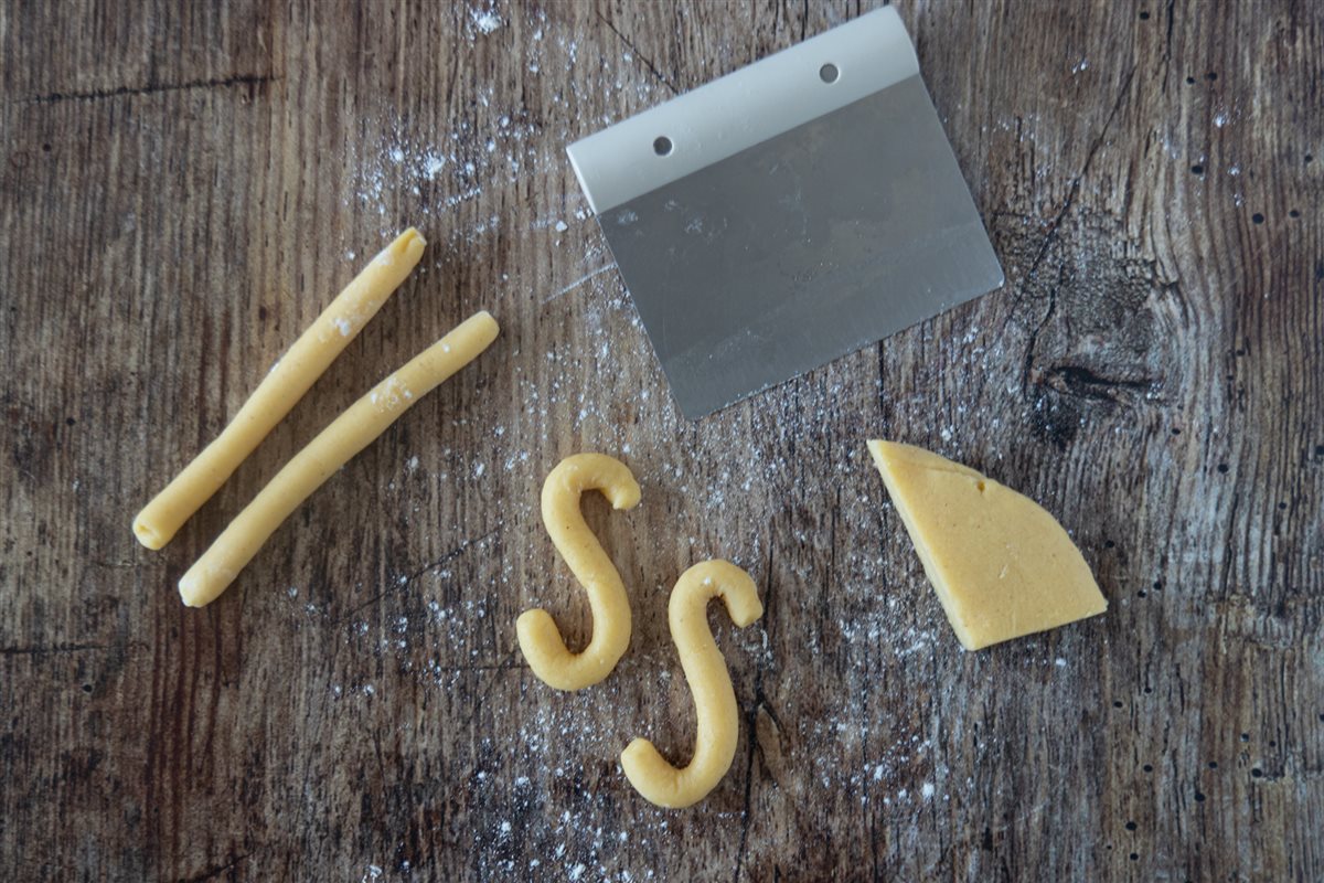 Una volta raffreddato, prelevate porzioni di impasto da circa 20 g l’una e, su una spianatoia infarinata, formate dei filoncini lunghi 13 cm. Modellateli a forma di "S", poi schiacciateli leggermente con un tagliere.