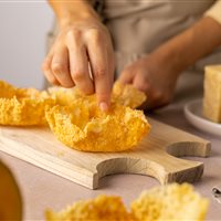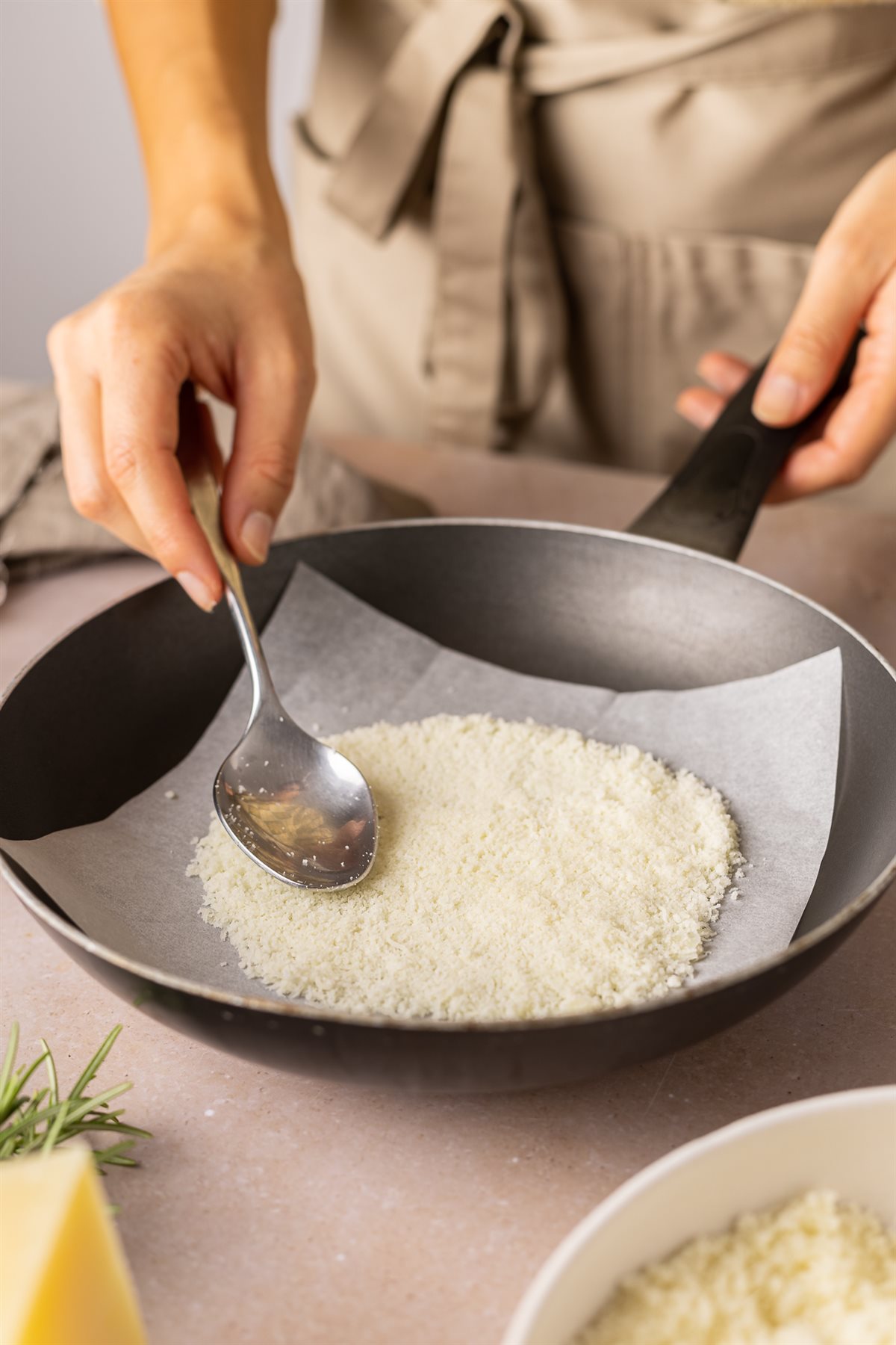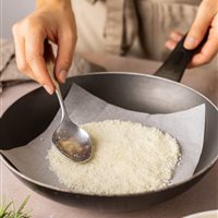 Grattugiate finemente il Montasio. Su un foglio di carta forno adagiato in padella, spargete 2–3 cucchiai di formaggio, formando un disco compatto.
