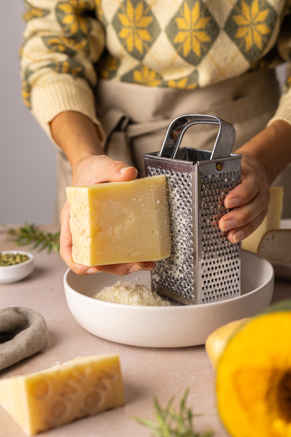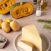 La croccantezza dei cestini di formaggio Montasio si fonde con la morbidezza della crema di zucca e patate, profumata da qualche ago di rosmarino.