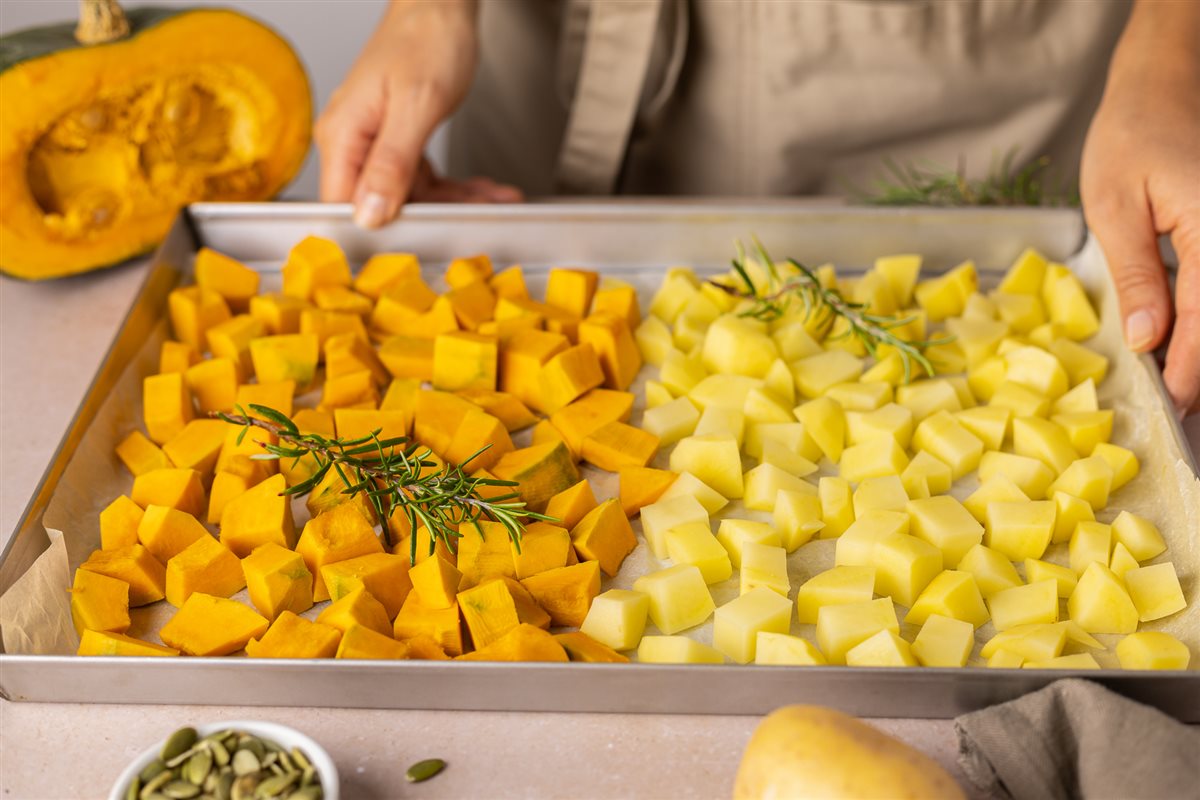 Sbucciate zucca e patate, riduceteli a cubetti e disponeteli su una teglia con carta forno. Aggiungete rosmarino, sale, pepe e un filo d’olio evo.