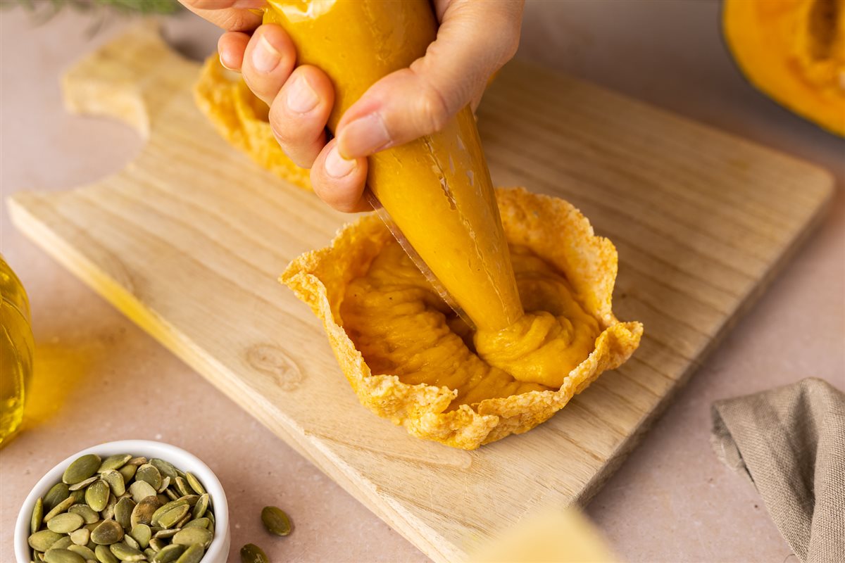 Riempite ogni cestino con la crema di zucca e patate.