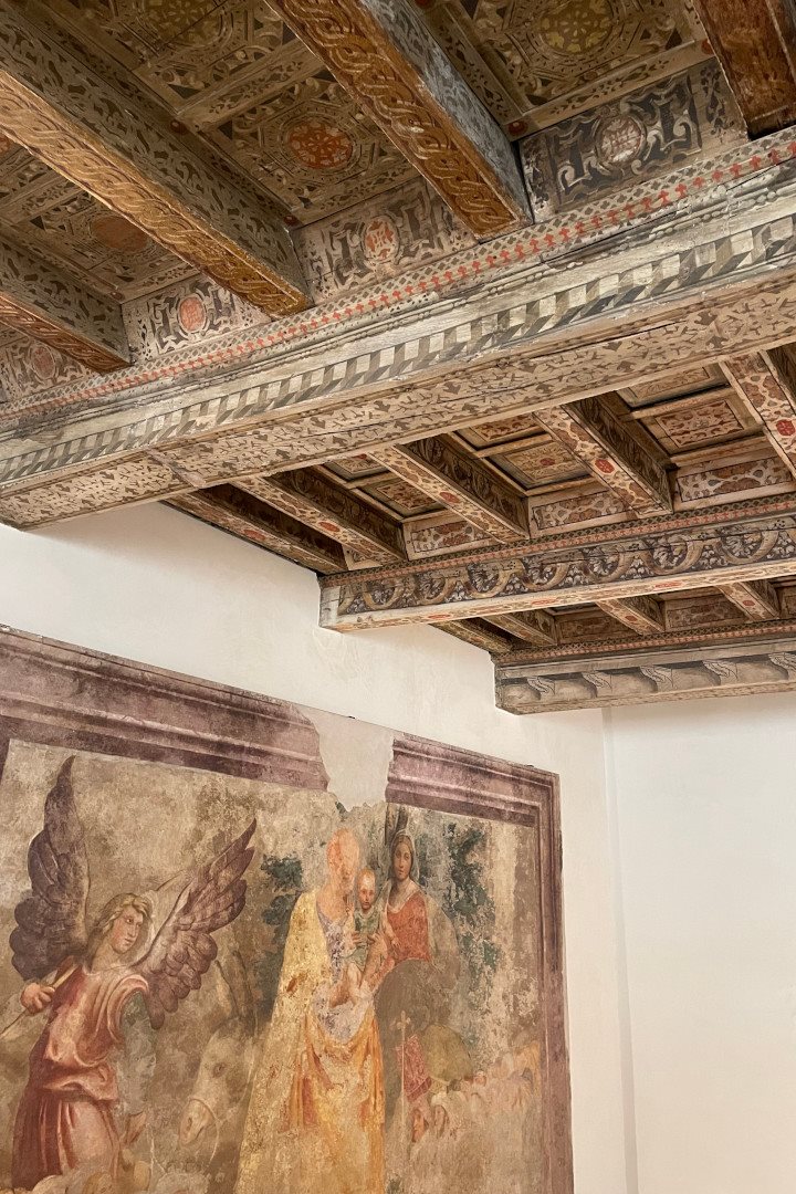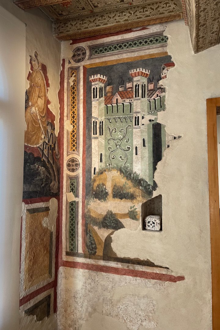 Più che un edificio che “ospita” le opere d’arte, possiamo senza ombra di dubbio considerare lui stesso uno chef d'œuvre! Sia al primo che al secondo piano sono visibili dei lacerti di opere ad affresco: scene di caccia ed allegoriche, ispirate all’epica carolingia e alle storie di Tristano e Isotta per non parlare dello scalone d’onore che ci conduce al primo piano e ci fa sentire dei conti e delle contesse!