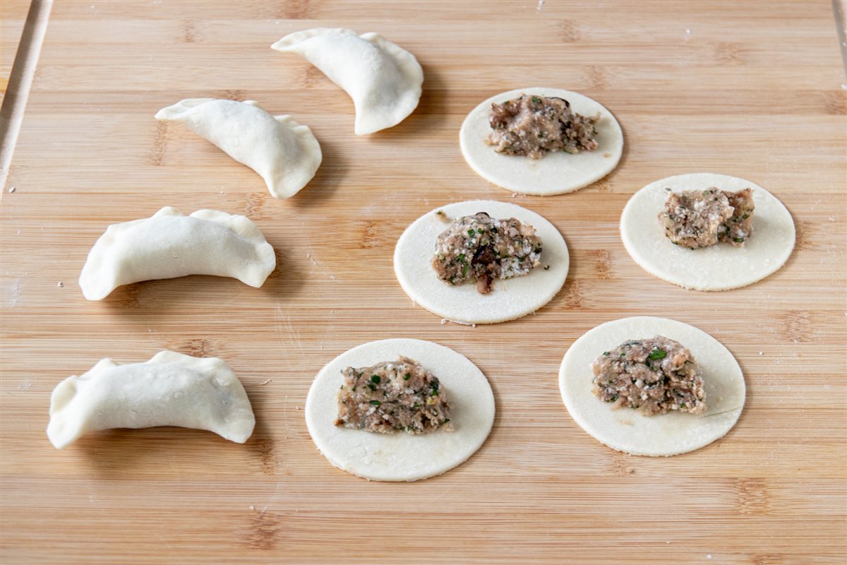 Mettete al centro di ciascun disco un cucchiaino di ripieno, richiudete a mezzaluna facendo uscire l’aria e sigillate bene i bordi. Capovolgete ogni cjarsons e schiacciatelo leggermente al centro con il dito indice, per dargli la forma tipica. Disponeteli su un vassoio infarinato fino al momento della cottura.