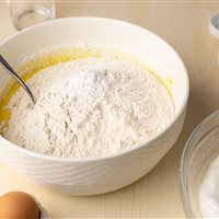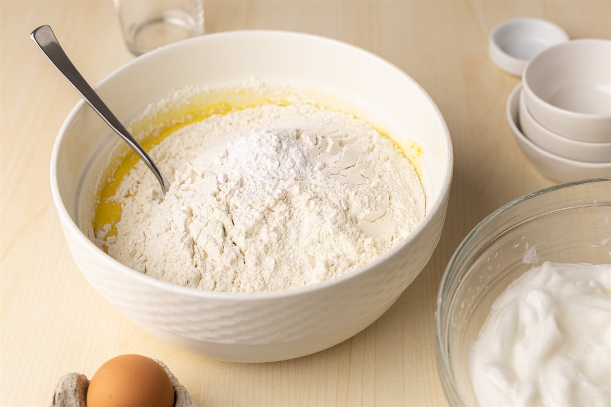 In una ciotola capiente aggiungere ai tuorli lo zucchero, la panna, il rum e un pizzico di sale. Mescolare, aggiungere la farina e il lievito, amalgamare bene, quindi incorporare gli albumi.
