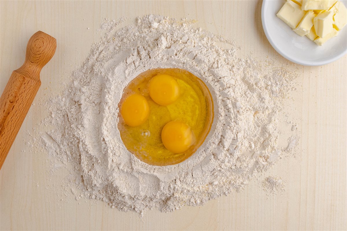 1. Unire le farine su una spianatoia a fontana. Al centro, aggiungere le uova e il burro ammorbidito.