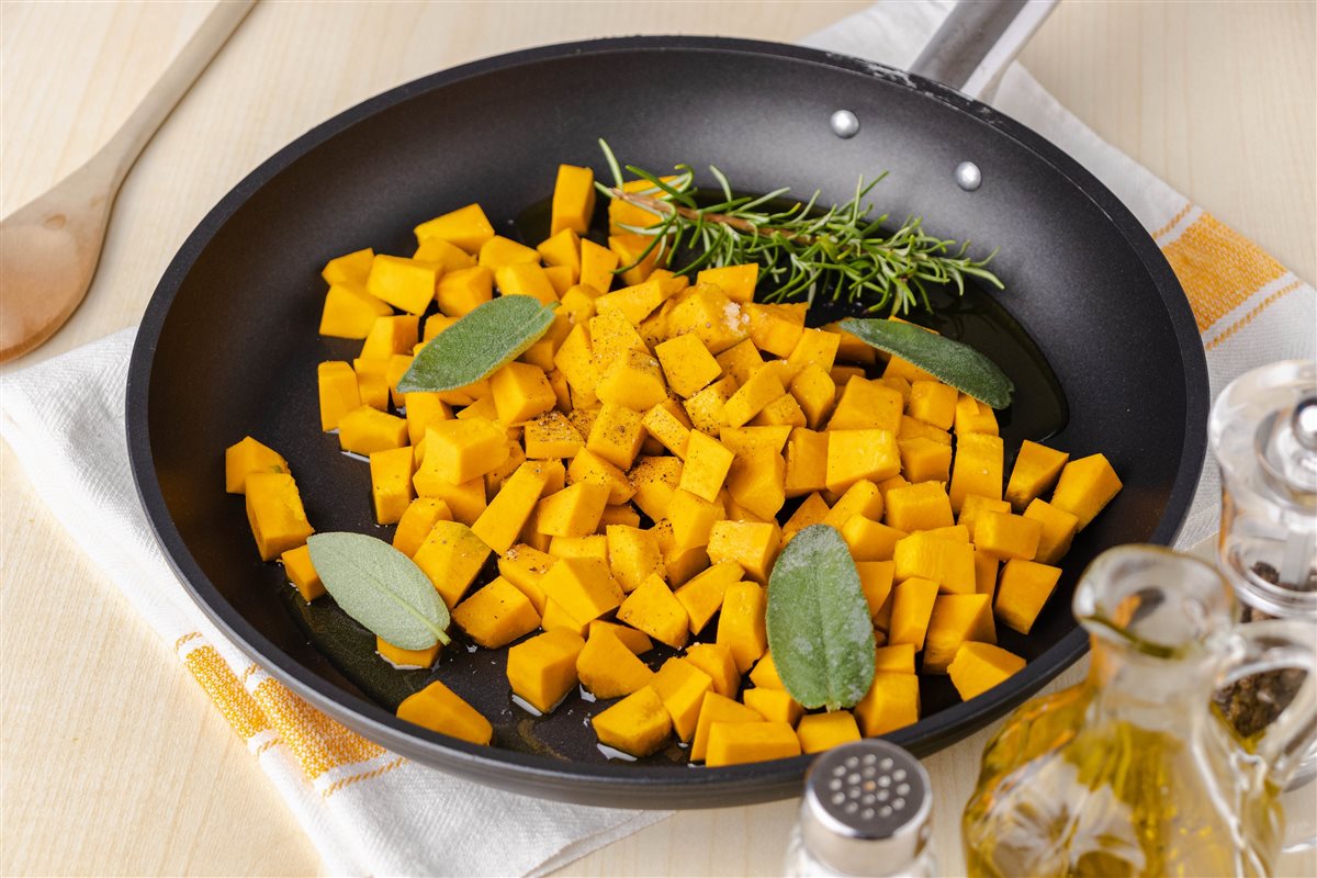 1. Pulire la zucca, tagliarla a cubetti e cuocerla in padella con olio EVO, sale, pepe, rosmarino, salvia e un po’ d’acqua. Cuocere finché la zucca non sarà morbida, eliminando poi gli aromi.