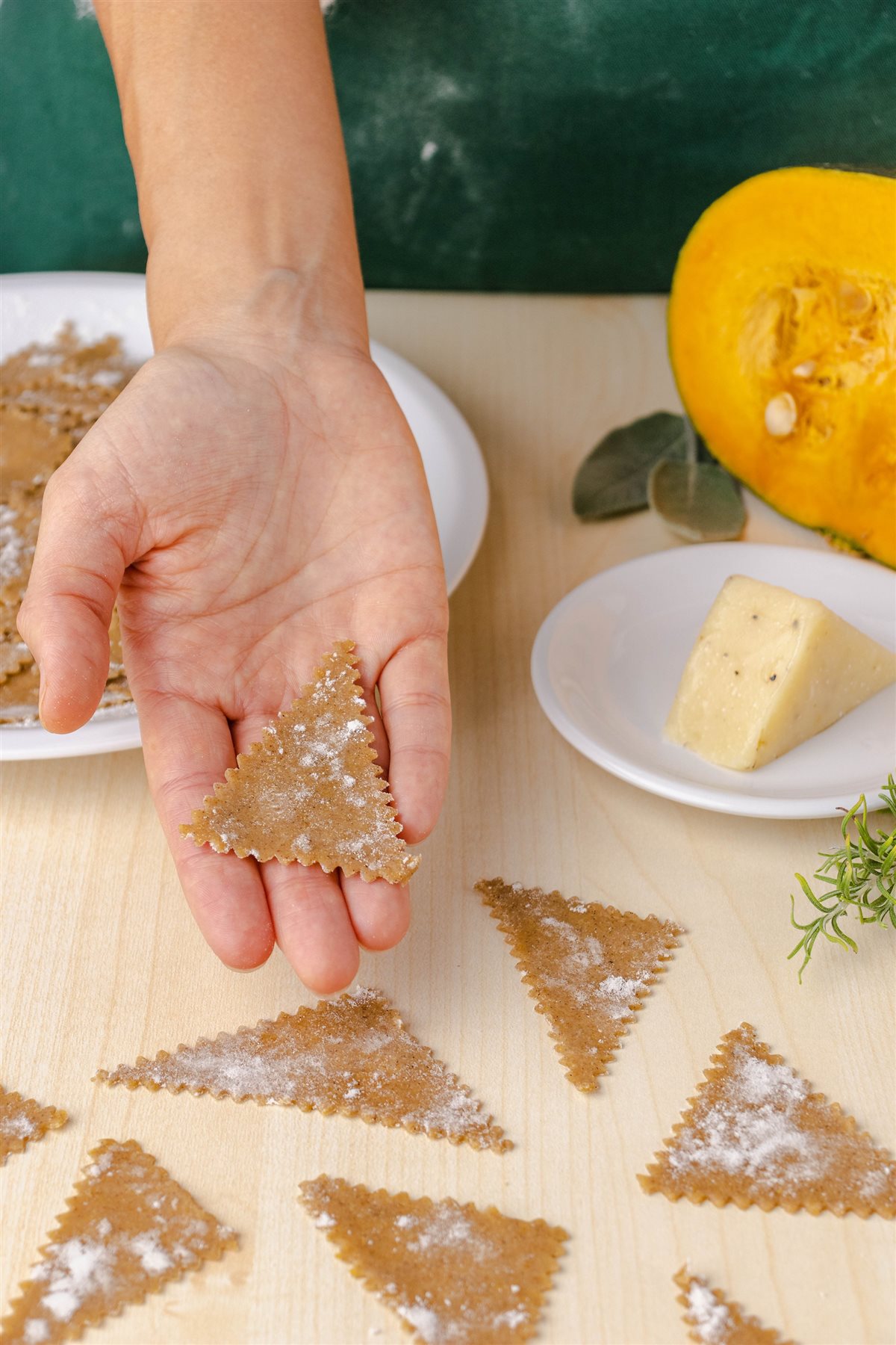 3. Stendere la pasta con il mattarello o la macchina per la pasta fino a uno spessore di circa 1-2 mm. Con una rotella tagliapasta, creare dei triangoli irregolari con una base di circa 3-4 cm.