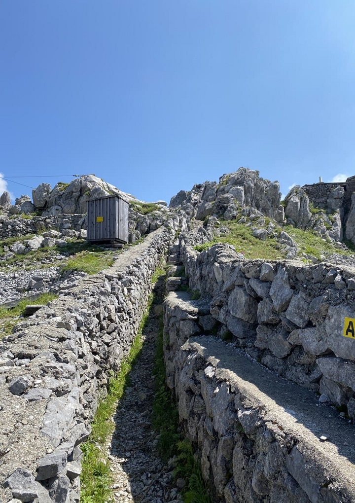 Gli ultimi metri portano ancora i segni dei bombardamenti, con profondi avvallamenti del terreno. Arrivati in cima si può accedere a uno dei siti del Museo all’aperto. Apparentemente la zona delle trincee sembra difficile da raggiungere. L’opzione più evidente è una ripida scala, utilizzata durante il conflitto (oggi per accedervi è consigliato avere i moschettoni da arrampicata). Meglio, dunque, decidere di fare il giro del costone montano e salire da una scala di legno più accessibile.