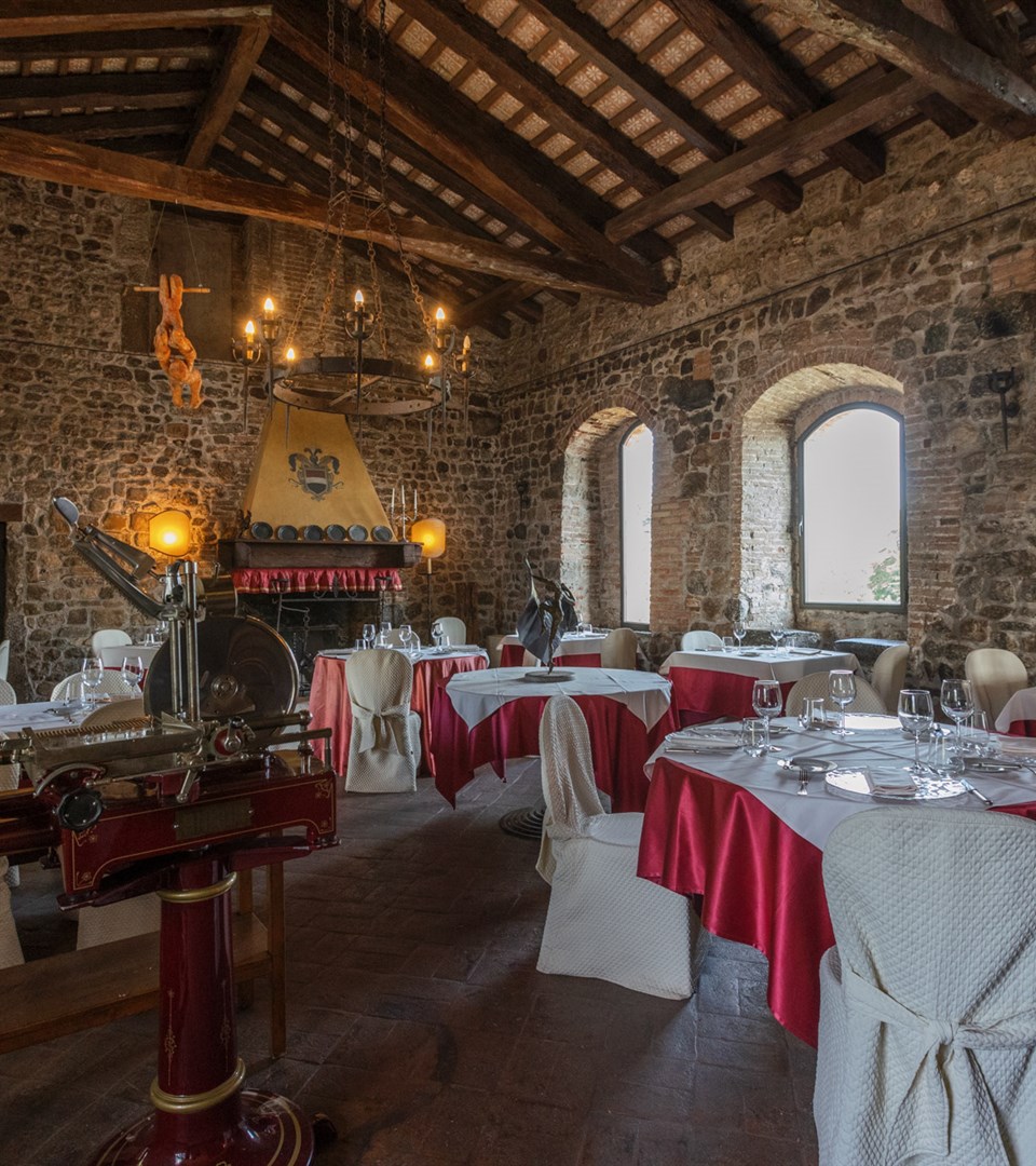 All'esterno un ampio giardino accoglie i visitatori che salgono la breve salita al colle, che potranno godere del ristorante oppure sedersi nell'enoteca al piano terra e gustare i "cicchetti" con un buon calice.