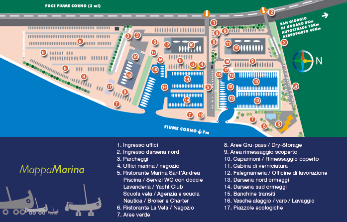 Il Marina Sant' Andrea situato a San Giorgio di Nogaro sorge alla confluenza del fiume Aussa e Corno, alla fine della laguna di Marano Lagunare e dista 13 km dall'uscita Porpetto-San Giorgio di Nogaro sull'autostrada A4 Venezia-Trieste e sulla A23 Alpe-Adria e 30 km dall'aeroporto di Ronchi dei Legionari. È facilmente raggiungibile in barca entrando a Porto Buso e risalendo lungo il fiume Aussa-Corno per circa 3 miglia; esso è localizzato sulla sponda sinistra.